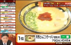 日本朝日電視台昨天播出《日本國民がガチ投票! 麺チェーン店総選挙2016》節目,由1萬名民眾進行票選,從全國十家連鎖麵店的菜單中(包含拉麵、烏龍麵、義大利麵、蕎麥麵、強棒麵),選出心目中最好吃的「麵」,而獲得第一名,是在台灣也享有高知名度的一蘭拉麵「天然豚骨拉麵」。